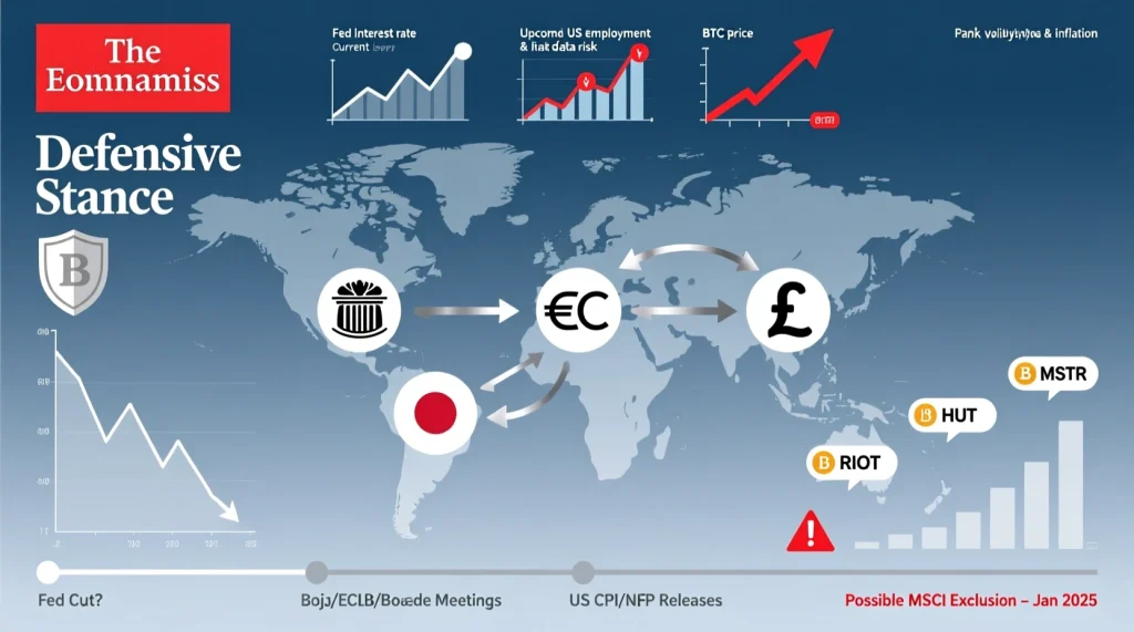 После третьего снижения ставки ФРС на 25 б.п. рынки ожидают паузу, а Investing.com и Reuters сообщают, что трейдеры снижают риски перед выходом данных по занятости и инфляции в США, а также решений Банка Японии, ЕЦБ и Банка Англии. История резких просадок BTC на фоне предыдущих повышений ставок Банком Японии и опасения по поводу глобальной ликвидности являются основными причинами текущей оборонительной позиции.Акции компаний с цифровыми активами под давлением, несмотря на успех MicroStrategy